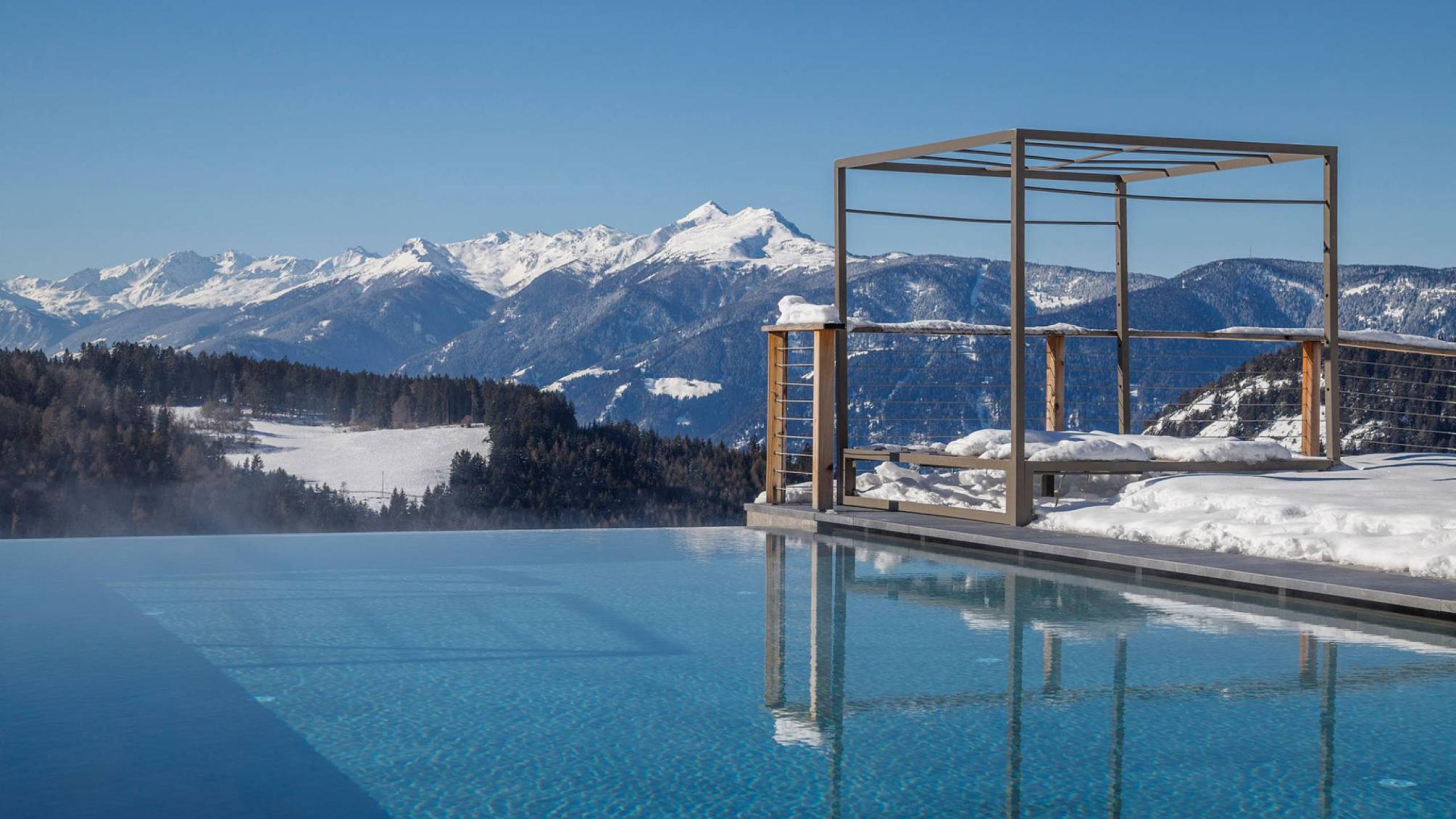 - Relaxation room with floating loungers and comfortable chaise longues overlooking the Avelengo mountains