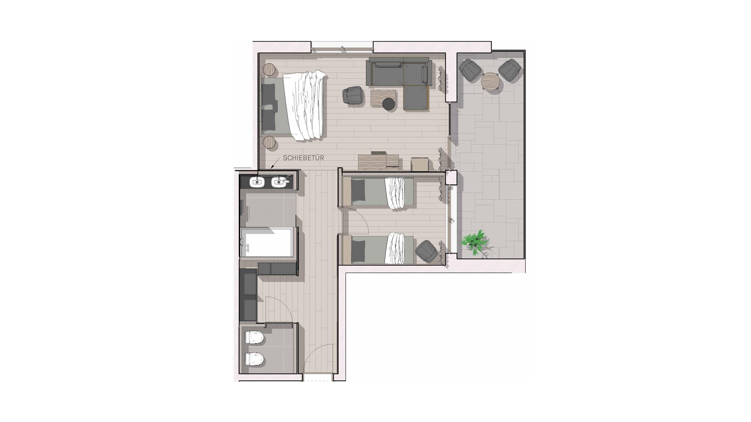 The Achillea suite offers plenty of space for your holiday dreams – and a 15m² balcony facing east: a wonderful place to enjoy the morning sun. Pets aren’t allowed in this suite.