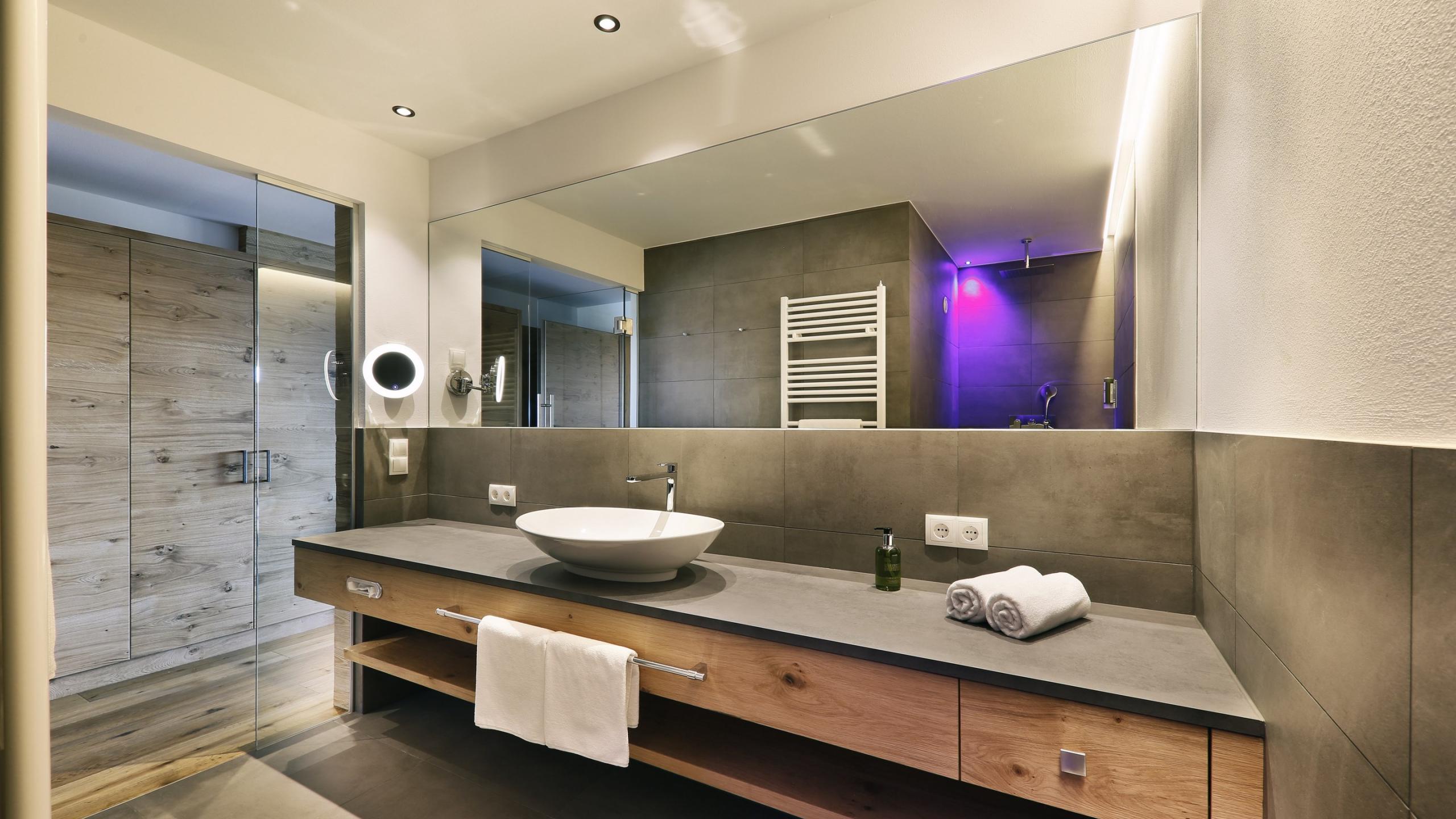 - Bathroom with large walk-in rain shower, large washbasin, hairdryer, and cosmetic mirror