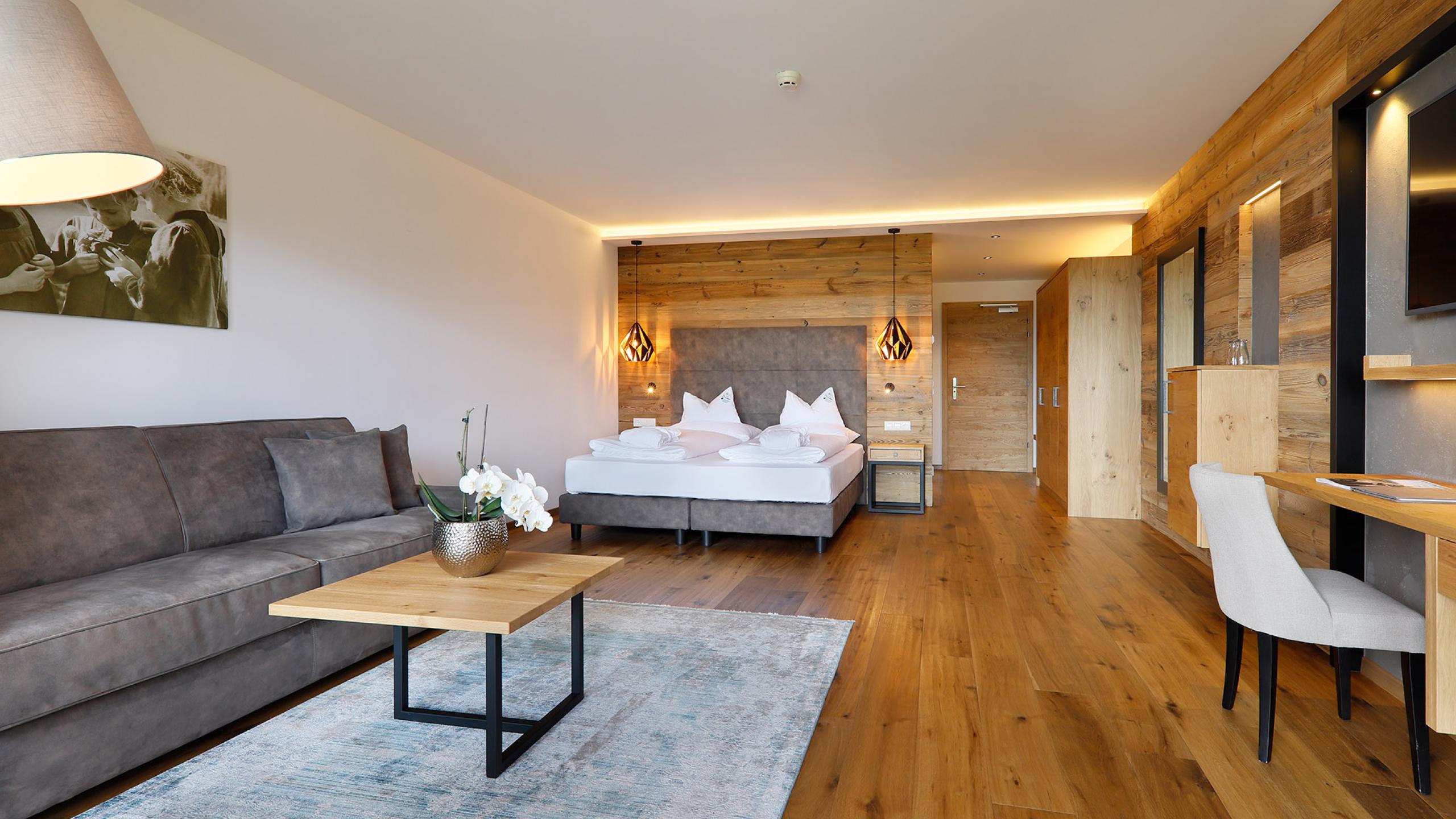 With natural wood floors and elegant oak furnishings, the Liebstöckel junior suite will become your personal haven of comfort. Pets are allowed upon request.