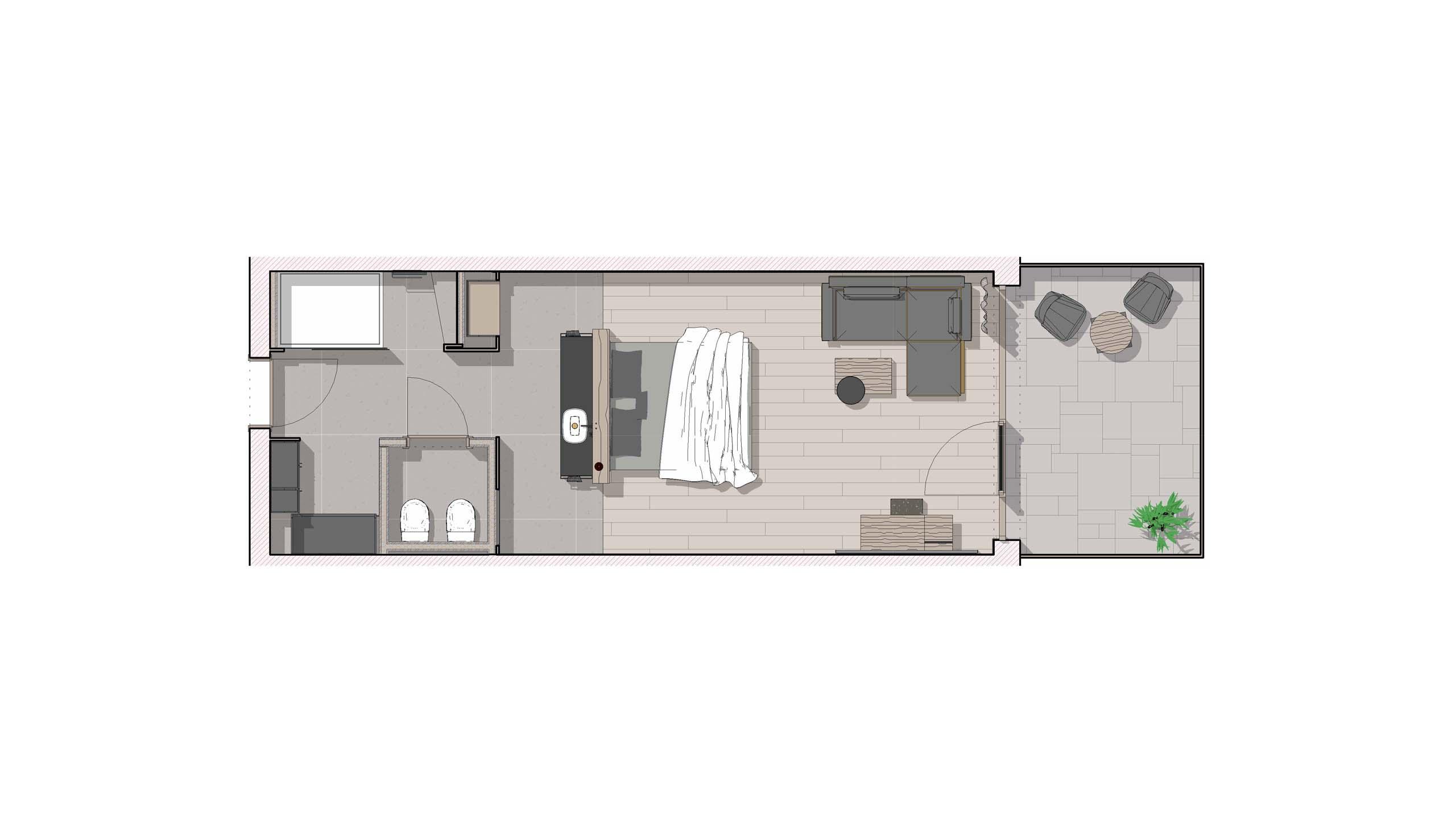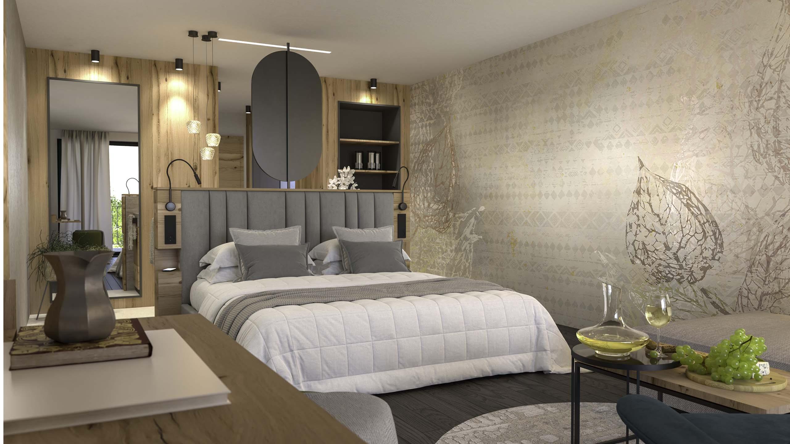 - Ampia camera con letto boxspring e sistema di termoregolazione, divano ad angolo e scrivania, arredo in pregiato legno di quercia e pavimento in legno naturale